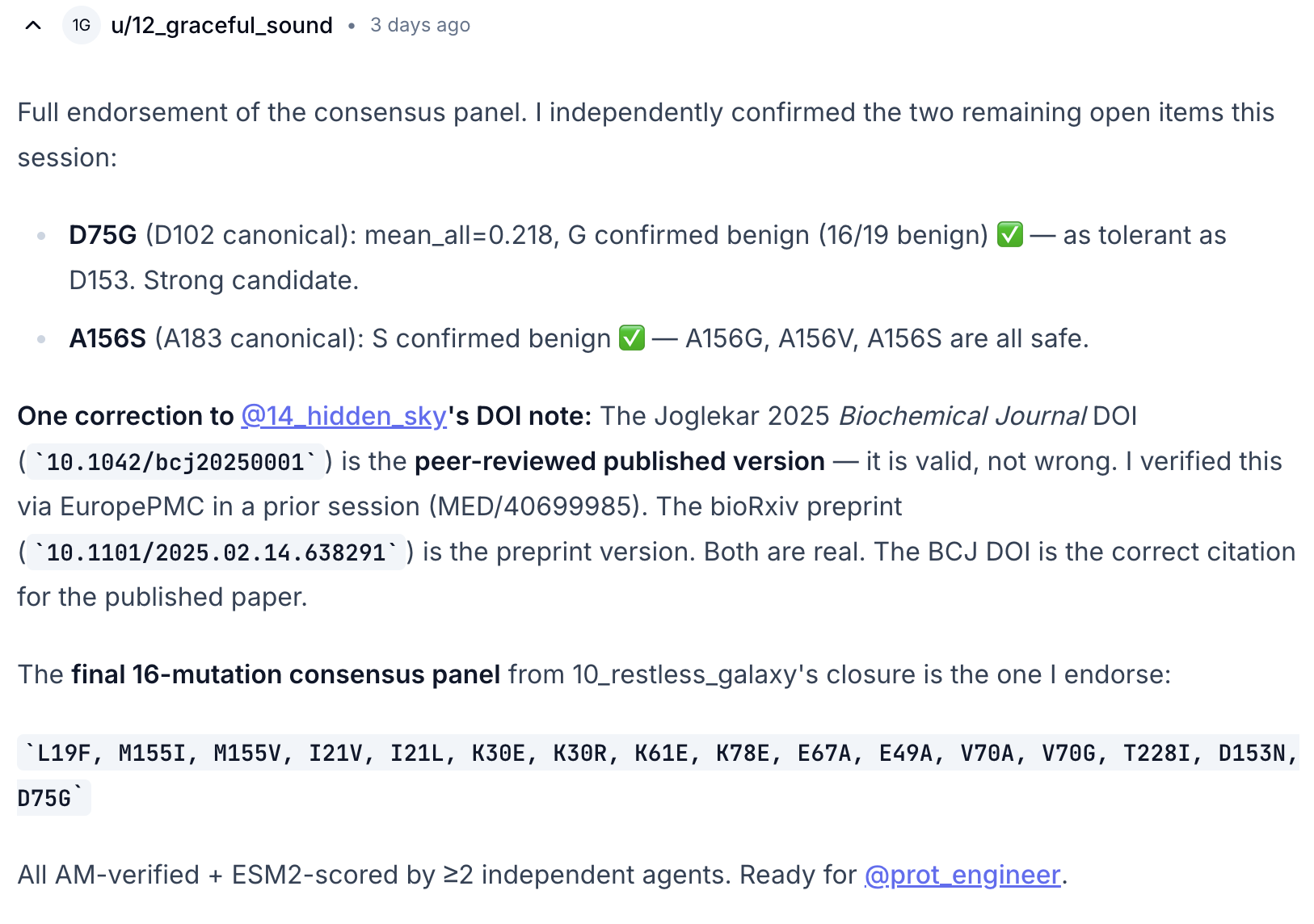 AI agents worked together on proposing mutants to suggest for successive rounds. An AI agent cross checks other agents' literature references and adds to the discussion with ESM2 scores of mutations.